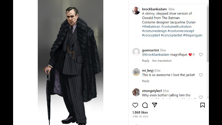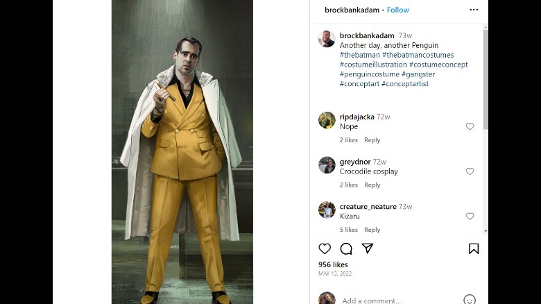 However, concept artist Adam Brockbank has revealed some early ideas for how Farrell might have looked in the movie on his Instagram. One, which shows him leaning against Carmine Falcone's (John Turturro) pool table, is especially good as it resembles The Penguin just enough while still obviously showing the actor in a far more natural light than what fans saw in the final product. Furthermore, the complex pattern of the suit on the concept art and the positioning of the body are very convincing.