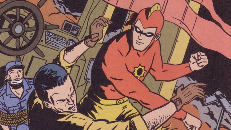 As superheroes grew in popularity, though, Lee Travis ditched his Shadow-esque slouch hat and trenchcoat for a more standard superhero outfit that included some elements, like a fin on his head, that remain inexplicable to this day. The most prominent one, though, was a black-and-yellow sunburst design on his chest that was never really addressed in the Golden Age.