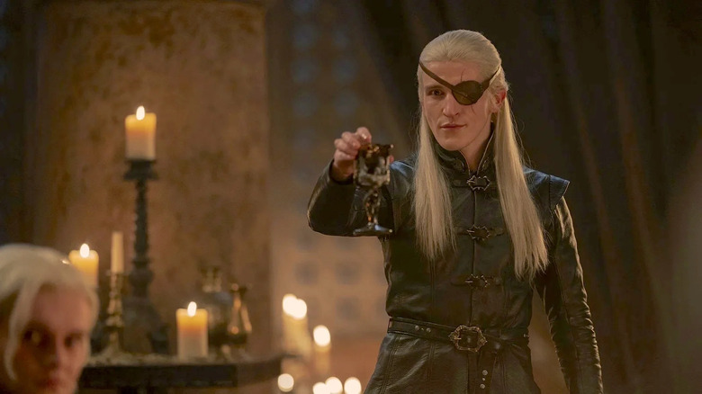 Another character that features in "House of the Dragon” from its premiere episode, Ser Criston Cole (Fabian Frankel) unhorses Daemon Targaryen during the tourney for Prince Baelon's birth, and later defeats the prince in combat. Criston is a likeable guy — at first. In Episode 2, "The Rogue Prince," Rhaenyra appoints Criston to the Kingsguard, a considerable elevation in status for the Dornish knight. Ser Criston accompanies Rhaenyra during the princess' impromptu trip through the Kingswood in Episode 3, and the two give in to passion during Episode 4, after Daemon lures Rhaenyra to a brothel — then abandons her.