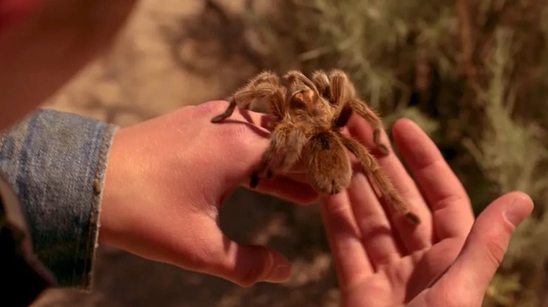 "Breaking Bad" takes place mostly in Albuquerque, New Mexico, with its vast stretches of the desert being a recurrent presence throughout the series. Such deserts are home to innumerable creepy crawlies, including the dangerous tarantula. Season 5, Episode 5, "Dead Freight," opens with a kid getting off his bike to pick up one such tarantula and put it in a glass jar. The kid, Drew Sharp (Samuel Webb), unfortunately, shows up at the spot where Walt, Jesse, and Todd Alquist (Jesse Plemons) have just completed their methylamine heist and are celebrating. Drew waves at the three men, and while Walt and Jesse are dumbfounded, Todd waves back with a smile and then shoots him dead.
