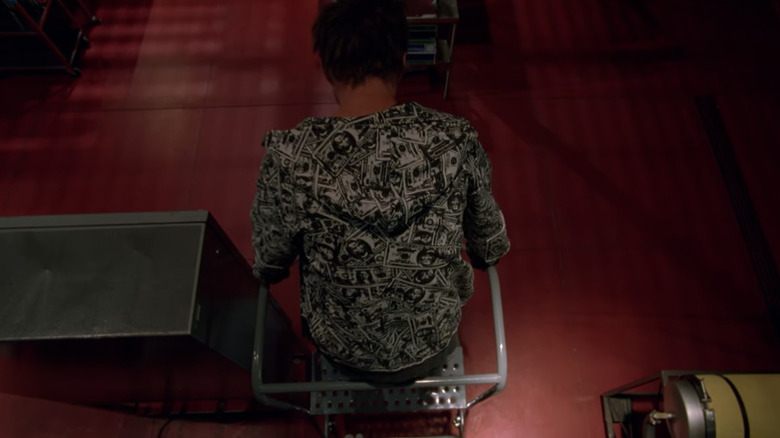 The hoodie design is simple and unmistakable, covered with different black and white dollar bills. What's interesting about this hoodie is that it might not actually belong to Jesse. He arrives at the lab earlier in the episode wearing a completely different yellow hoodie, and he doesn't seem to leave the lab before donning the dollar bill hoodie. Perhaps the hoodie secretly belongs to Gus or Victor. It could even be Walt's emergency lab sweatshirt.