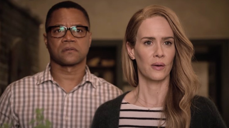 This is where the show starts to be particularly scary. Season 7 of "AHS" is called "Cult" and is rooted in the 2016 presidential election of Donald Trump. Set in 2017, "Cult" follows a group of people in a Michigan suburb who are reeling after the election — particularly a queer married couple named Ally (Paulson) and Ivy (Alison Pill). After Trump is elected, some people feel horror and worry and wonder what it means for the fate of the country, while another group of people, um ... well, let's just say they feel differently about the outcome of the election. A cult of Trump supporters begins making life unsafe and miserable for the suburb's residents while trying to recruit people to their cause. From there, it's a suburban war that brings death, turmoil, and boatloads of fear.