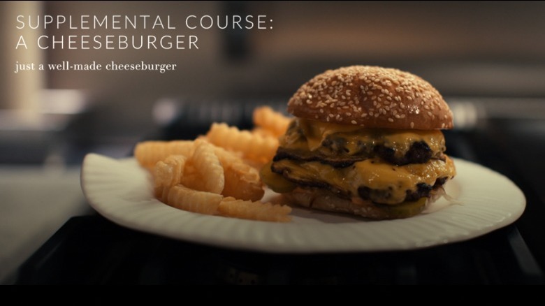 For the top three, we will start with the supplemental course: a cheeseburger. At this point in the film, Margot is doing anything she can to survive. She knows she does not belong at this dinner, and she finally figures out a way to escape the nightmare. Margot tells Julian that she has a problem with the food and that she's still hungry. Margot points out that Julian and his chefs do not make a single dish with love and care as most passionate chefs do. Julian, feeling frustrated with Margot's dissatisfied feelings, says he will make her anything she wants. To that, Margot requests a cheeseburger with crinkle-cut fries.