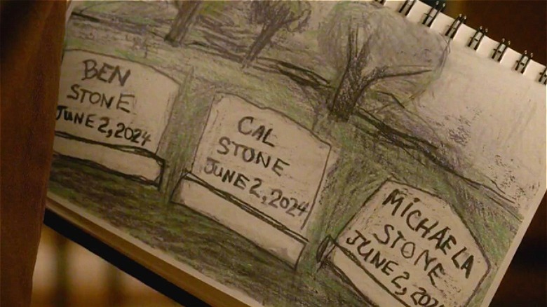 - Tombstones: Cal draws three tombstones with his, his dad's, and his aunt's names on them ("Estimated Time of Departure").