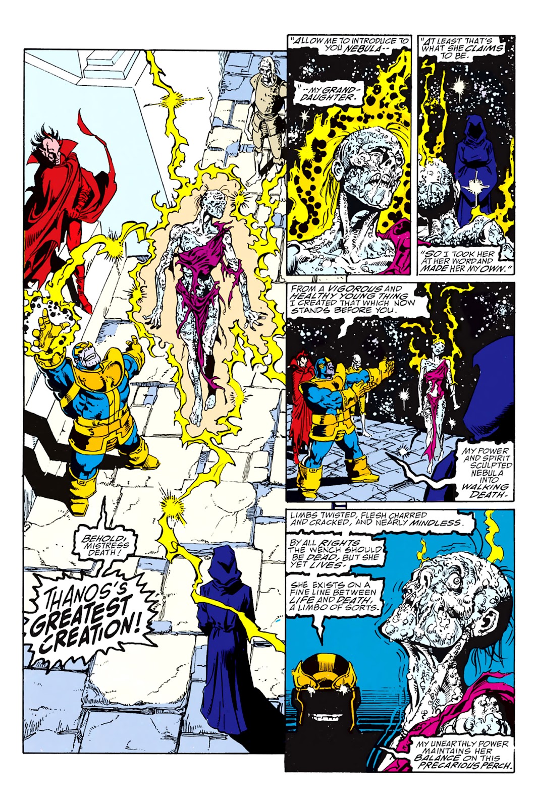 Infinity War pulls most of its inspiration from the 1991 six-issue series The Infinity Gauntlet, which similarly pitches every Marvel Comics hero against Thanos as he works to wipe out half the universe. In that story, Nebula is also a target of Thanos' torture, being kept barely alive as a part of his sadistic tribute to the living embodiment of Death.