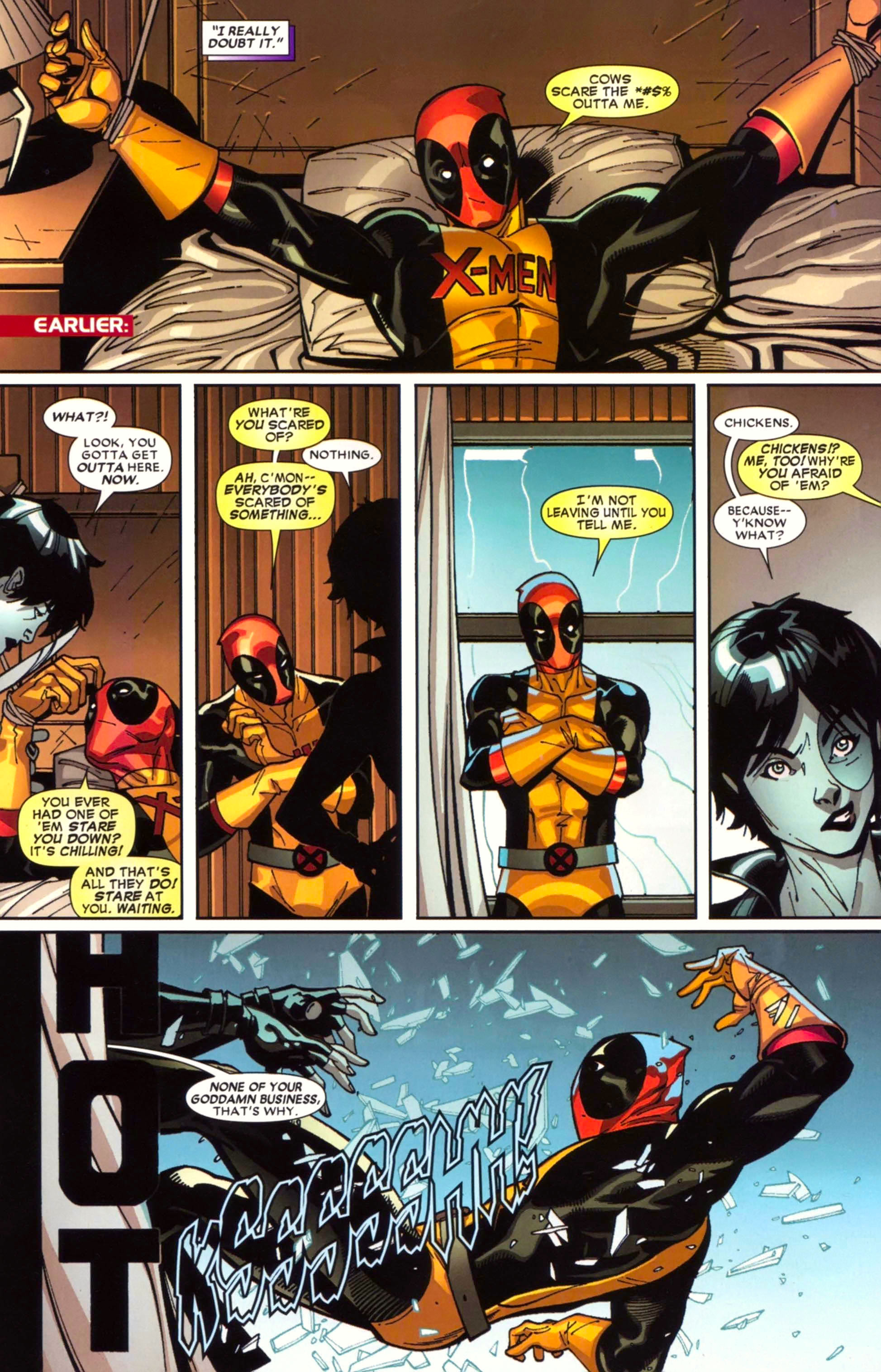 In the events leading up to X-Force #24, Russell was captured by a mutant-hating group called the Friends of Humanity, leading the X-Force to mount a rescue operation while he was in transit — pretty much what happened in Deadpool 2, but with fewer crotches landing on Cable's face.