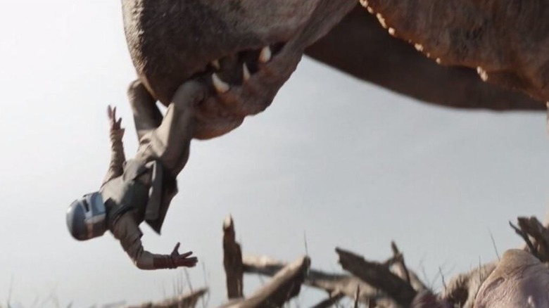 Immediately after the attack, Din and Paz Vizsla (Tait Fletcher, voiced by Jon Favreau) kick off the first event in the All-Mandalorian Common Sense Olympics by attempting to chase the monster with their jetpacks. This ends in a disqualification as the former takes flight with a pack that's running on fumes, and promptly runs out of gas mid-chase. That's all right, though, because Paz then reveals that it's actually impossible to chase this particular creature with a jetpack.