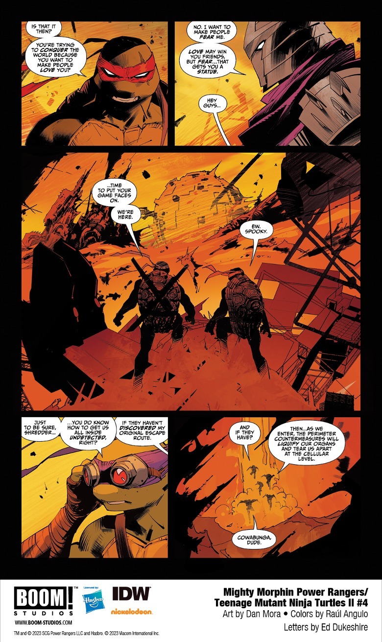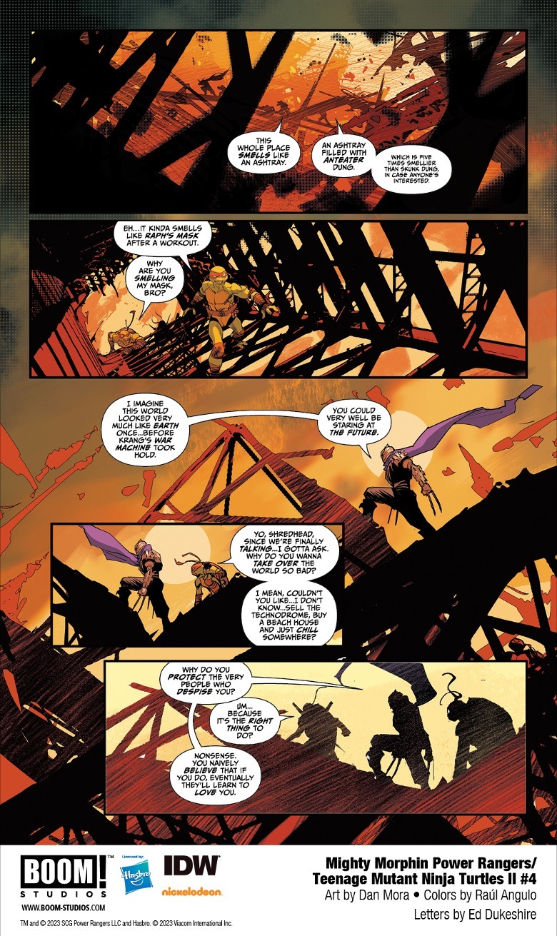 In Looper's exclusive preview of "Mighty Morphin Power Rangers/Teenage Mutant Ninja Turtles II" #4 by Ryan Parrott ("Rogue Sun"), Dan Mora ("Batman/Superman: World's Finest"), Raul Angulo and Ed Dukeshire, The Turtles venture through Dimension X alongside Shredder, as they question who they can trust after getting intel from Casey Jones' Ranger X. They sift through the ruins of Dimension X, pondering what it used to look like before battles and waring decimated the world. During their trek, the Turtles ask Shredder why he's lived a life of villainy, and they get a genuine response from their usual enemy. He tells them he wants people to fear him as fear, not love, is what people remember.