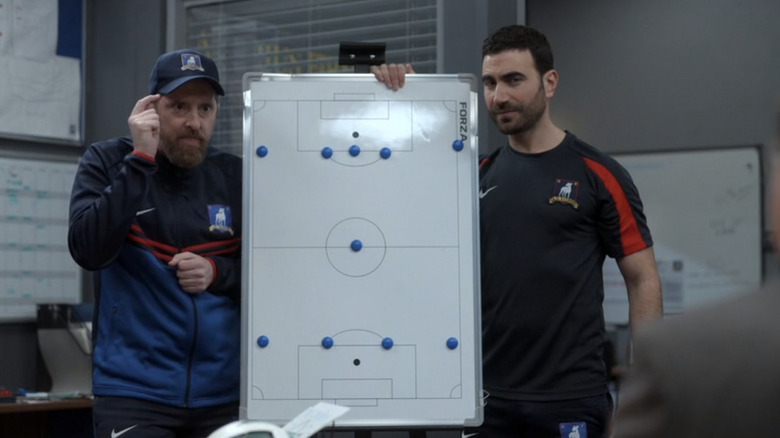 In the "Ted Lasso" Season 3, Episode 4 scene, Roy and Beard act as stand-ins for Rachel and Phoebe, while Higgins replaces Joey. The coaches are grasping at straws to find a way to beat West Ham, leaving Higgins as the voice of reason. They're trying to outsmart Nate, a tactic that's clouding their judgment. Even the dialogue of both scenes is vaguely similar. "So we gotta stop thinking like Nate and start thinking like Nate would think that we would think if Nate were thinking like us," Beard tells Roy and Higgins. It's in the same vein as what Phoebe says to Rachel and Joey: "They don't know that we know they know we know!" Whether the moment is an intentional "Friends" reference is anyone's guess, though it definitely feels like a purposeful throwback.