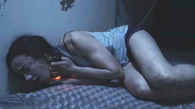 "Like Dogs" begins with a kidnapping — or so you think on your first viewing. Lisa (Annabel Barrett) is snatched off the street and taken to a massive dog kennel with multiple empty stalls. She's chained to the wall and left alone, but every so often one of her captors, wearing what amounts to a full hazmat suit, comes to feed her a bowl of dog food or spray her down with a hose. Lisa's miserable situation gets a tiny bit better when her captors introduce her to Adam (Ignacyo Matynia), another victim who's been locked in a different part of the kennel for weeks.