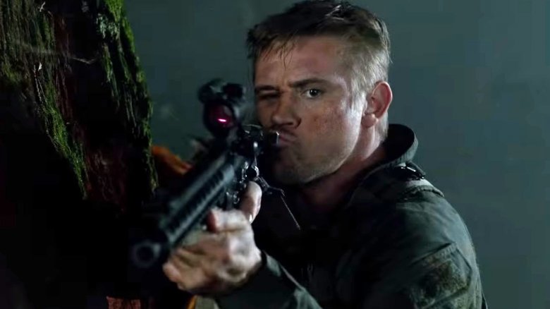The Predator jumps into the plot from the very first scene, which sees Boyd Holbrook's Quinn McKenna on an assassination mission in Mexico. He's interrupted by a crashing spaceship and manages to pull a few pieces of predator memorabilia from the wreckage — specifically a helmet, an arm band, and a little ball that lets him turn invisible. Correctly assuming that the government is going to be all over him once they track him down, he swallows the ball and mails the rest of the alien contraband to his P.O. box in the U.S. Like anyone would do, really.