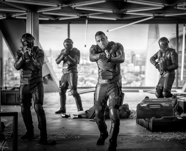 The snap shows a suited-up Elba pointing a gun at someone off screen. Behind him are three masked men, likely members of his mysterious crime syndicate or fear-mongering organization, and a woman lying motionless on the floor, which is littered with glass. Whatever happened in the moments leading up to this photo clearly wasn't pretty.