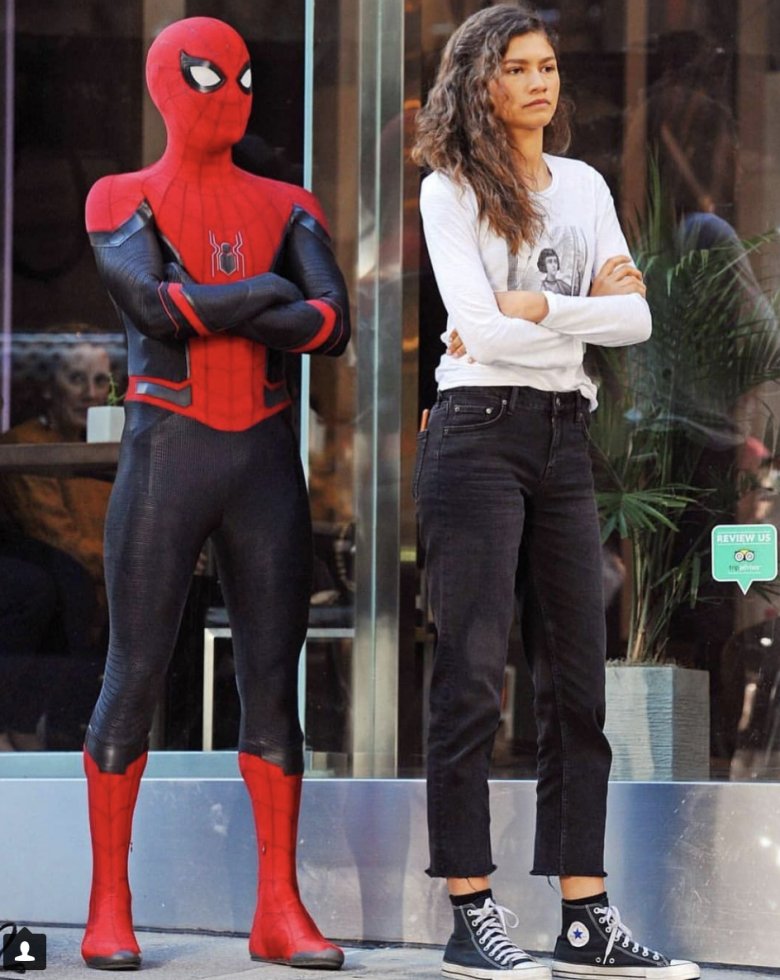 "THATS A WRAP #farfromhome," Holland captioned the snap, which features him in a slick new black-and-red Spidey suit and Zendaya wearing cropped black denim jeans, high-top Converse shoes, and a white tee with an illustration of Joan of Arc displayed on the front. (Could that choice of shirt be a subtle nod to the Joan of Arc-inspired look Zendaya rocked the 2018 Met Gala?) The dynamic duo are seen standing outside what looks to be either a restaurant or a hotel (peep the TripAdvisor sticker in the window), with their feet shoulder-width apart and their arms folded across their chests. They look powerful AF, guys.