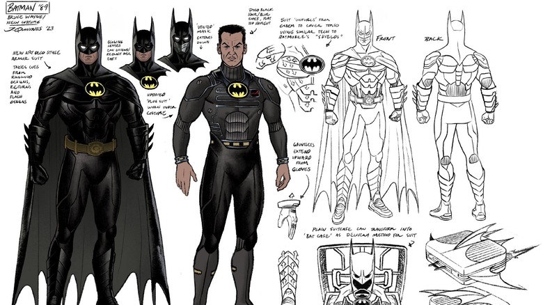 Batman gets his own redesign in "Batman '89: Echoes," with Quinones sharing a new design sheet featuring Michael Keaton's Caped Crusader getting a unique ensemble, technology, and features throughout his Batsuit. One of the coolest details is the suit unfurling from his Batman emblem and a suitcase delivery system for the outfit.