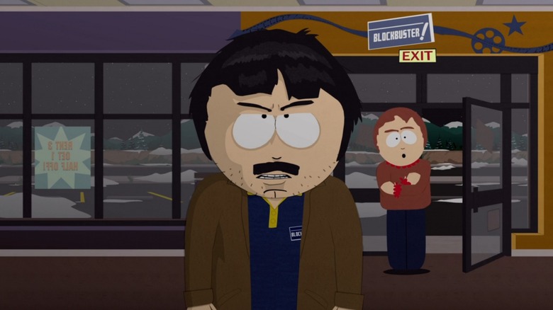 A true blast from the past, "South Park's" Season 16 episode "A Nightmare on Facetime" has a little bit of everything. It parodies both Blockbuster video and "The Shining," with Randy Marsh taking on the persona of Jack Nicholson's Jack Torrance from the latter. Randy buys a Blockbuster video store for a cheap price, not realizing that streaming services and Redbox machines have largely made the store's business model obsolete. As no one enters the store, he starts seeing ghosts and having hallucinations, mirroring the experiences of Jack at the Overlook Hotel. A ghost in the form of a former Blockbuster employee starts trying to convince him to kill his wife, which he tries and fails at.