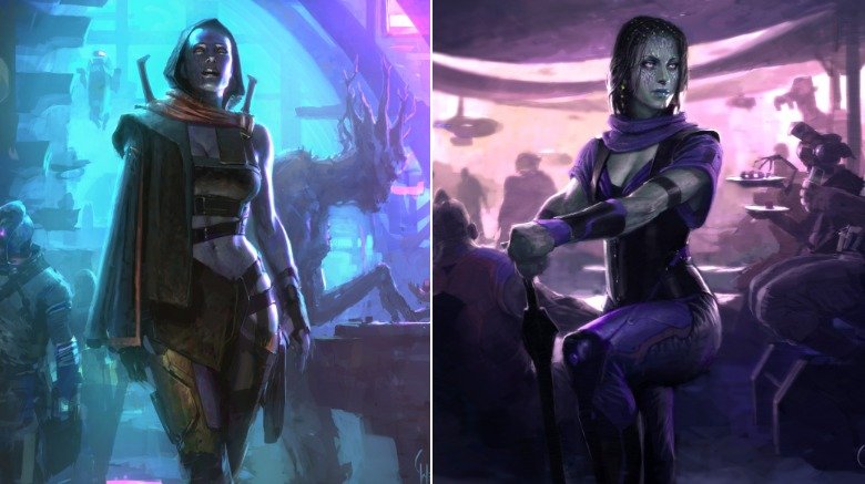 As Gamora's look evolved, her character began to emerge in the concept art Charlie Wen created. In these images, we see two similar settings and scenarios for the character — Gamora in a crowded sci-fi locale, surrounded by aliens and other outer space weirdness. But you can see that even though the Gamora in the left image is undoubtedly cool, the one on the right seems to have a lot more in common with the version of the character we got in Guardians of the Galaxy. The Gamora on the left is on the hunt, while the Gamora on the right seems lost in thought.