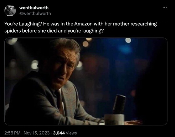Immediately after the trailer debuted, viewers latched onto the "He was in the Amazon" line, dropping a variety of memes to point out just how ludicrous it is. Rather quickly, the internet's premier jokers created a visual template that features one character telling another the hilarious line. For example, here's X user @wentbulworth riffing on a pivotal scene from "Joker," where Robert De Niro's character calls out the titular Joker (Joaquin Phoenix) for laughing at Madame Web's mother's plight.