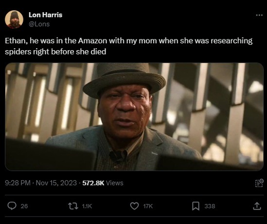 While there's a lot to like about the trailer (the various intricate costumes, for one), the internet is obsessed with one thing: how Ezekiel was in the Amazon with Cassie's mom when she was researching spiders right before she died. If you've been on the internet over the last few days, chances are you've seen a variation of this line shared in one way or another. Johnson gives the expository, awkwardly said (and probably ADR'd) line just over halfway through the trailer, and it's already become the internet's favorite meme of the week. User @JohnDiLillo on X (formerly known as Twitter) called it "one of the funniest line readings I've ever heard."