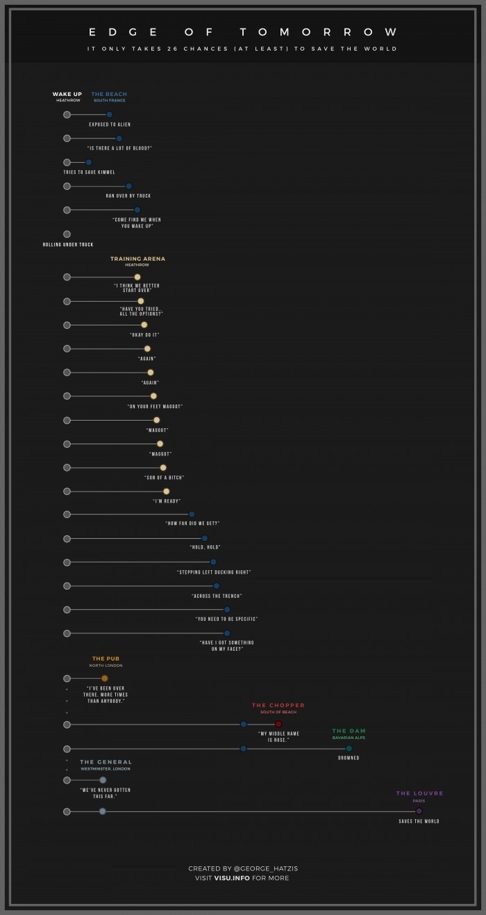 An immersive and playful picture that riffs on classics like "Groundhog Day," the film stands out as one of Cruise's most fascinating non-franchise offerings. Throughout the nearly two-hour-long film, Cruise dies a number of times, forcing his day to reset. Just how many times does the action maverick die on-screen in "Edge of Tomorrow," though? An infographic by X (formerly known as Twitter) user @george_hatzis from 2015 reveals that Cruise dies a whopping 26 times on-screen in the sci-fi flick.