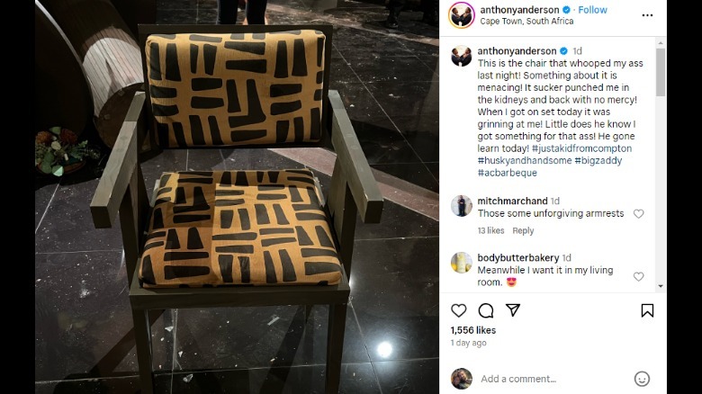 Still, the only action Anderson wants at the moment is revenge on the chair that laid him out. "This is the chair that whooped my a** last night!" he wrote after posting a picture of the four-legged fiend. "Something about it is menacing! It sucker punched me in the kidneys and back with no mercy! When I got on set today, it was grinning at me! Little does he know I got something for that a**! He gone learn today!"