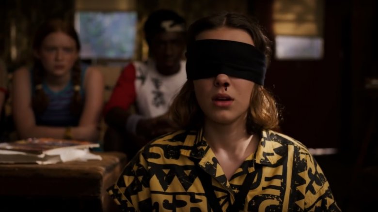 We see Eleven in her sense-depriving blindfold early on in the trailer, surrounded by her concerned friends. Her trademark nosebleed tells us that she's using her special abilities, and the following shot reveals what she's doing with them — the gifted girl is shown (wearing the exact same '80s-tastic shirt as the previous shot) in the hellscape that is the Upside Down, standing in front of a large steelworks warehouse.