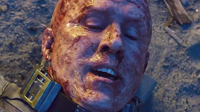 The ensuing fight sees James team up with his brother once more, as neither can stop the upgraded Wade on their own. The fight destroys much of the facility, but comes to an abrupt end when James decapitates Wade, leaving him for dead. After James and Victor go their separate ways, the decapitated head of Weapon XI breaks the fourth wall and shushes the audience with his mouth once more exposed as his body parts begin to move toward his head.