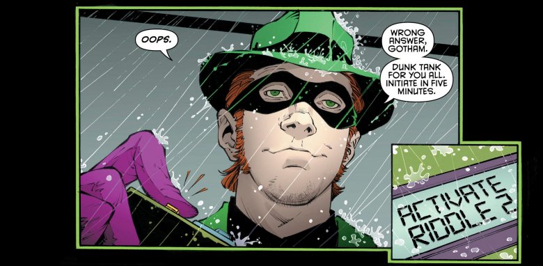 For those unfamiliar with the flamboyant villain, the Riddler is the brainchild of Bill Finger and Dick Sprang, who made his print debut in the October 1948 issue Detective Comics #140. A criminal mastermind who relishes in complex riddles and has a flair for the dramatic, leaving clues at crime scenes for Gotham City authorities to find and often boasting about his genius-level intellect, the Riddler is intensely competitive and obsessed with puzzles. This passion began at an early age, starting with a puzzle contest he entered through his school, and evolved into something much bigger and more sinister in his adulthood. When the Riddler learned that he could get away with cheating, he started a life of crime — donning a green-black-and-purple costume littered with question marks, cheating people out of money and pride, and styling himself as an enemy of Batman, whom he deemed to be a worthy opponent in mental combat. In his first stand-off with the Dark Knight and his sidekick Robin, the Riddler attempts to murder them on a pier, then disappears into thin air and leaves his signature question mark insignia behind.