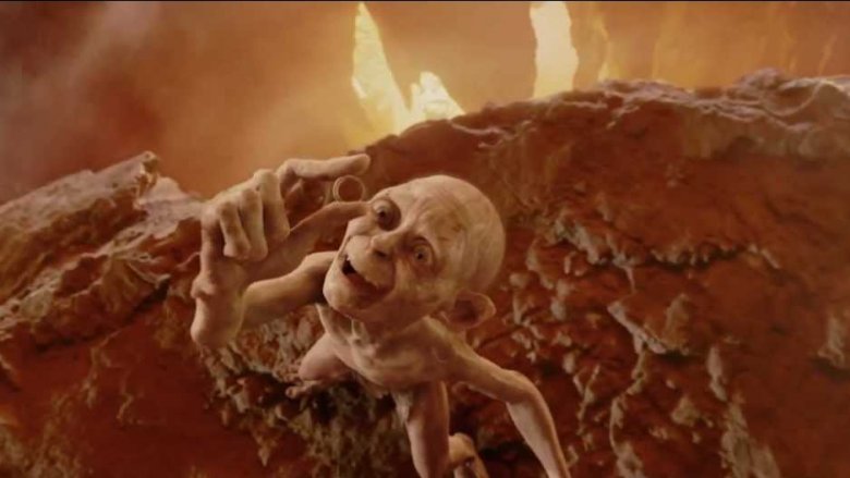 As Sam catches up, he sees Frodo fall victim to the lure of the One Ring, claiming it as his own. At that point, Gollum reappears yet again, grappling with Frodo and biting off his ring finger. While dancing with joy at regaining his prized possession, the withered creature is tackled off the ledge by the injured Frodo. Gollum falls to a fiery death, still holding the One Ring, which melts in the heat, while Frodo is pulled back up the cliff by Sam.