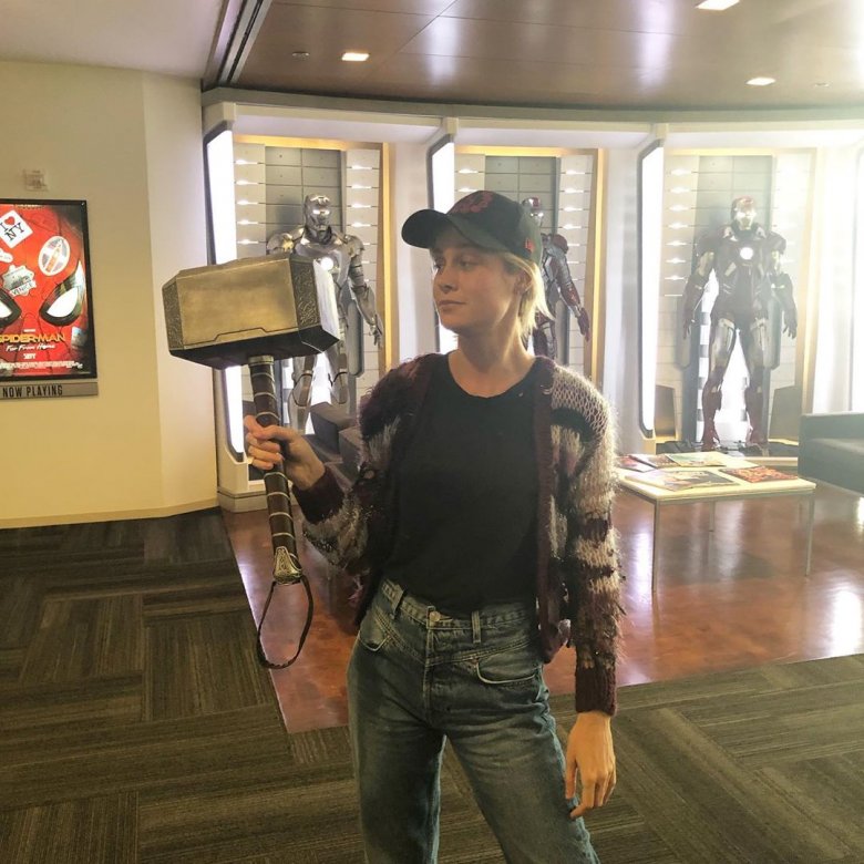 Earlier this week, Captain Marvel and Avengers: Endgame star Larson posted the photo below to her Instagram, which appears to have been taken in an office at Marvel Studios (check out the Spider-Man: Far From Home poster adorning the wall, and the multiple Iron Man suits in the background). Larson captioned the image, "Not to be whatever, but... I told you I could lift it."