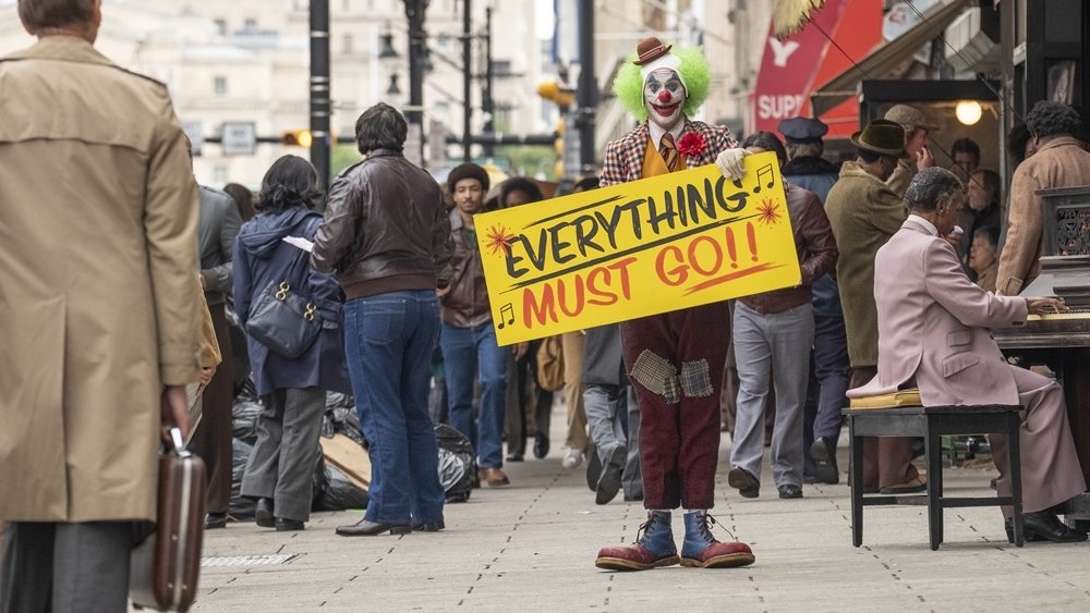 The next part of Joker's opening scene takes place on a busy street in what Phillips refers to as "Gotham Sqaure," as Arthur — in full clown costume — is busy twirling a sign and cavorting for passersby. Phillips revealed that the scene was shot on location in Newark, New Jersey, with the storefronts made up to fit in with the flick's early '80s setting — but that for the wide establishing shot, only the foreground is actually, you know, real. The entire background, with its looming skyscrapers and cars humming back and forth in the distance, was accomplished with CGI.