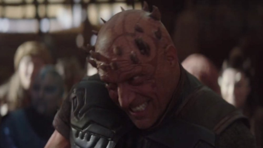 Cleared to go track down Cara Dune and enlist her services in what looks to be the climactic showdown of the first season of The Mandalorian, Mando returns to her stomping grounds on the planet Sorgan, last seen in the fourth episode. When we're reintroduced to Cara, she's back at the bar and engaging in a bit of entertainment — a knock-down, drag-out, bar fight complete with some futuristic weapons. But hey, this time the grappling is all in good fun, and it could very well be seen as a reference to actress Gina Carano's off-screen past as a mixed martial arts fighter. After all, if you've got an MMA fighter on set, you're probably going to want them to show off their skills.
