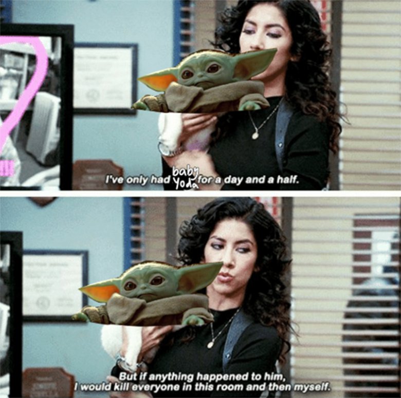 Extreme? Probably. But also so valid. (And yes, there are variants of this joke featuring the Mandalorian's head Photoshopped on top of Brooklyn Nine-Nine actress Stephanie Beatriz as well.)