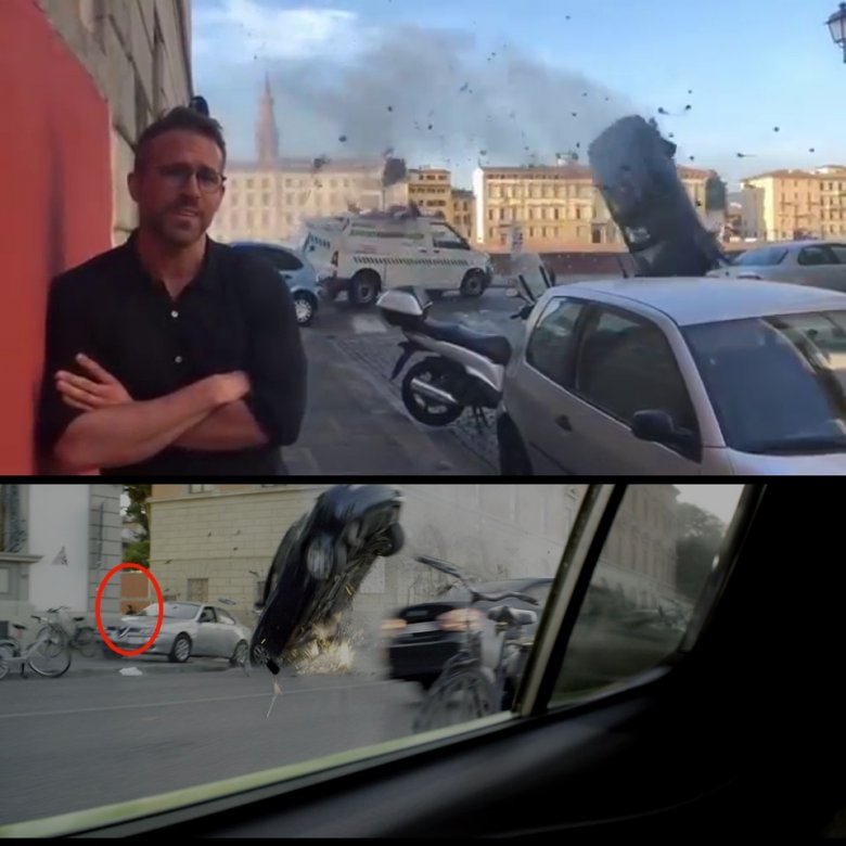 The clip is, of course, comedy gold. What Reynolds apparently failed to realize, however, is that while recording it, he was actually in the shot that was being captured — in the far distance, but visible nonetheless. Said shot made it into the finished film, and one intrepid Redditor quickly noticed that during the scene (in which Reynolds' character was supposed to be in one of the cars involved in the crash), the actor could be spotted in the background, doing his comedic shtick. Check it out:
