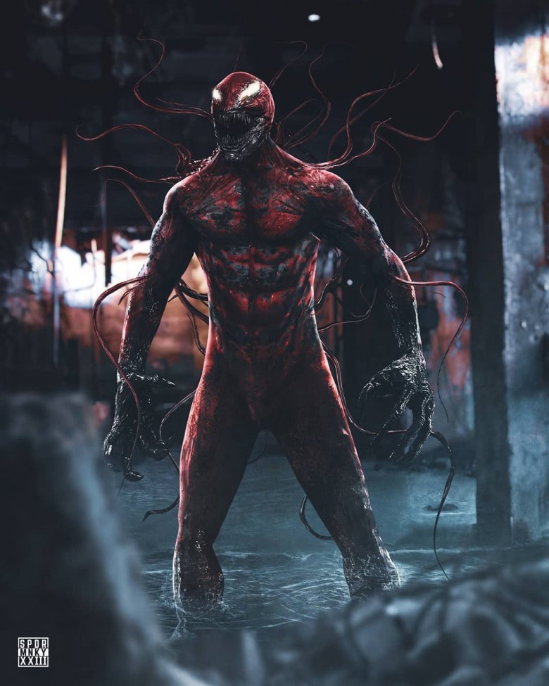Now, we all know that Venom, the symbiote which has a complicated relationship with its host Eddie Brock (Tom Hardy), is scary enough; we certainly wouldn't want to bump into him in a dark alley. Carnage, though, is just a bit different. Rather than bonding with a morally complex but basically good guy like Brock, the symbiote which would become Carnage bonded with Kasady, a remorseless serial killer who (in Venom's mid-credits sequence) promised to slaughter innocents the moment he could find a way to escape from prison, and this before bonding with an entity that could make him practically unstoppable. The hell with dark alleys; we wouldn't want to bump into Carnage anywhere, and @spdrmnkyxxiii's rendering of the character is truly ghastly. Check it out: