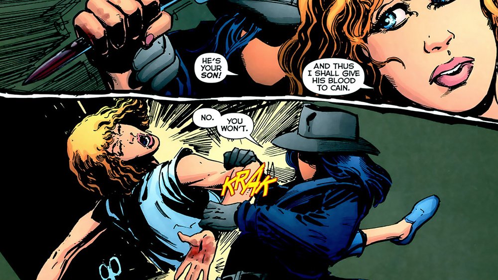 The whole thing centered on the Crime Bible, which is exactly what you think it is by reading those two words. It's a Bible, but for crimes. Focused on Cain — who you may remember from the regular non-crime Bible as the first person to ever do a murder — the Crime Bible taught "lessons of blood" to its adherents. The actual contents were left pretty vague, presumably because "Crime Bible" is not a title that requires a whole lot of elaboration, but it was definitely compelling enough to spark an entire "Religion of Crime" that had its own factions, complete with prophecies concerning the "twice-named Daughter of Cain" and "the Faceless One." Needless to say, the former was Kate Kane, better known as Batwoman, and the latter was Renee Montoya, whose mask as the Question had the effect of making her look like she had no face.