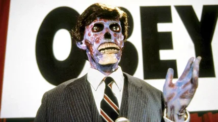 The hackers tell Nada that aliens have integrated themselves into society, disguised as everyday humans. The aliens have put subliminal messages on things like billboards and magazine covers in an attempt to turn humans into compliant consumer zombies. Nada discovers a pair of special sunglasses that reveal these hidden messages — things "Obey," "Conform," and "Consume" — and show the aliens in their true form. When he reacts the way one would react when they put on sunglasses and see humans turn into freakish alien beings, the aliens begin targeting him. It's a scathing critique of capitalism and media manipulation that feels just as — if not more — relevant today.