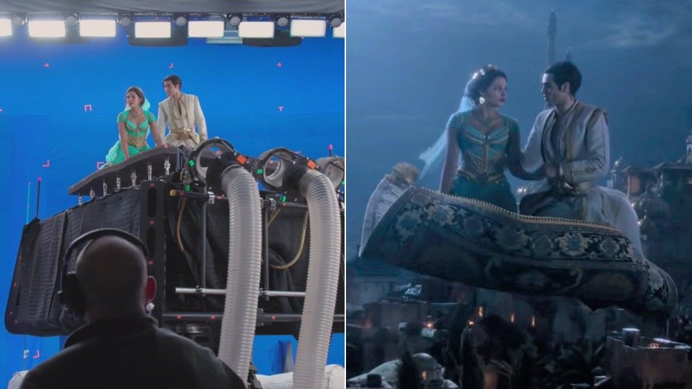 The footage they captured blended well with footage of Mena Massoud (Aladdin) and Naomi Scott (Jasmine), who mimed their own recording of the song in front of a giant bluescreen. "They built a rig 30 feet off the ground," Massoud said in a behind-the-scenes featurette. "This robotic arm had the rig on it and it moved any which way, because they had 32 different points of hydraulics attached. So it literally felt like a magic carpet. It was in incredible." According to Scott, the scene was quite the workout — the actors had to support their own weight as the rig shifted from side to side.