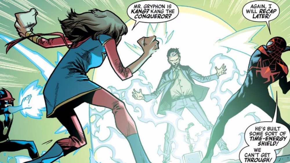 Thanks to the timestream being so glitchy and Kang's indifferent carelessness, he often accidentally creates different versions of himself. One of them is Mr. Gryphon, who is trapped in the early 21st century. Unable to time travel, he sets about conquering Earth. Lacking an army, he uses his advanced knowledge to create a financial empire. He tries to bring a Chitauri fleet to Earth, and when that fails, tries to take Thor's hammer, because of its time-bending properties. Thor knocks him into the timestream instead.