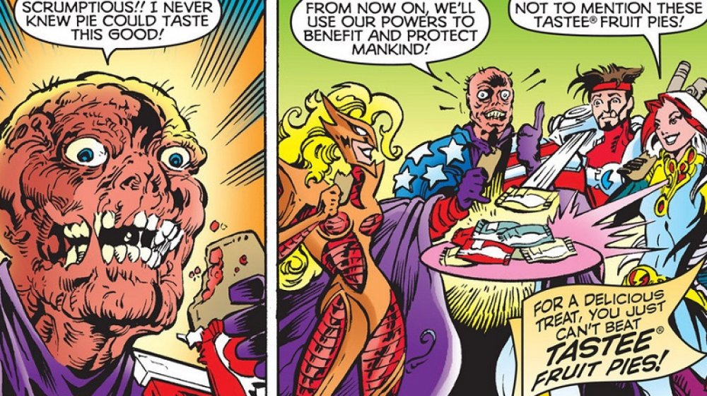 Perhaps the most effective use of Zemo's disfigured visage came in the one-page Hostess Fruit Pies ad parody in Thunderbolts #9. In "Turnover Turncoats," Zemo demanded to know why the Thunderbolts were laying around eating fruit pies instead of carrying out his mission of world domination. Of course, when he took off his cowl and revealed his face, it was both hilarious and extremely unsettling, especially when the pies brought him over to the side of good.