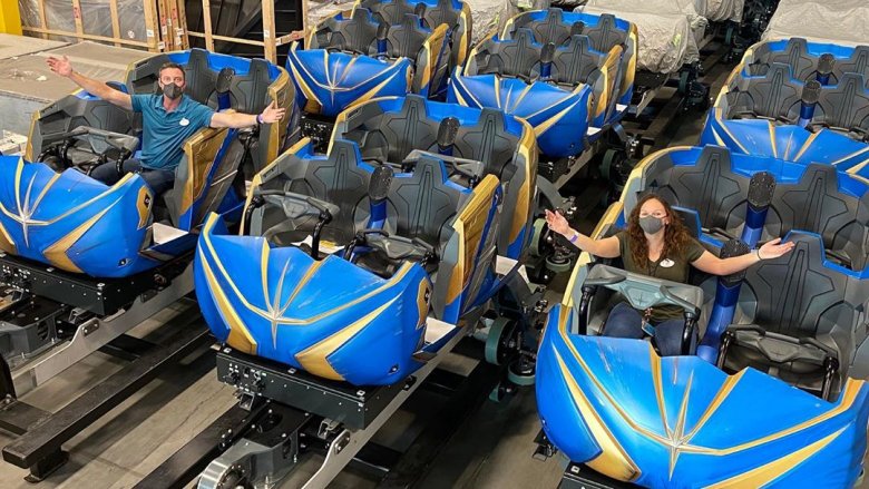 The photo, which features two ride engineers, captures six carriages in striking blue and gold, reminiscent of the kind of eye-popping shades audiences see in will likely see again in Guardians of the Galaxy Vol. 3. But Riddley noted that if you squint, you might notice that each one features a unique design element. "If you look closely at the colorful paint design on the vehicles (called coaches in roller coaster engineering parlance), each one is unique with different wear patterns and impact marks," Riddley wrote in his Instagram post. "Imagineers were inspired by markings that appear on NASA Space Shuttles and other spacecraft upon reentry into Earth's atmosphere."