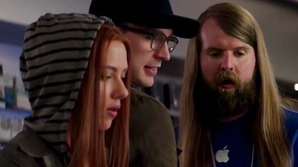 Based on his prior appearance, the now infamous character clearly has a bit of a tech background. And if you feel like you recognize the bearded, Thor-like facade of the actor who plays him (D.C. Pierson), you might also recall Aaron has a solid background in customer service too — though some might say he's got a history of overdoing it on the customer service front, though, because he was the overly-helpful Apple store employee in 2014's Captain America: The Winter Soldier, who kept barging in when Captain America (Chris Evans) and Black Widow (Scarlett Johansson) tried to do a little covert decrypting in