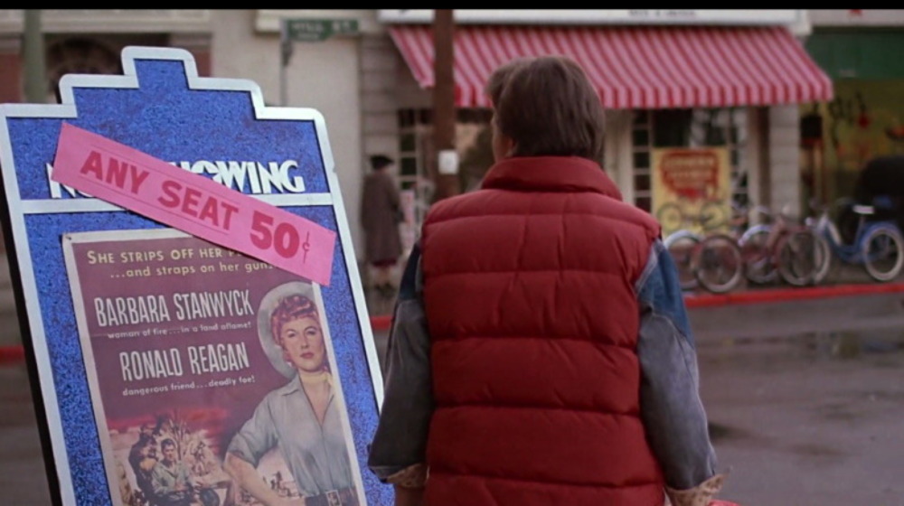 One of the funniest moments from Back to the Future came when the Doc Brown of 1955 asked Marty who the President of the United States was in 1985 — and then reacted with disbelief when he learned actor Ronald Reagan would become President Reagan in the future. According to former Reagan speechwriter Mark Weinberg, Reagan, who viewed the film for the first time at Camp David, "got a kick" out of an early scene where Marty walked by a 1955 movie theater advertising the Reagan film, Cattle Queen of Montana (1954).