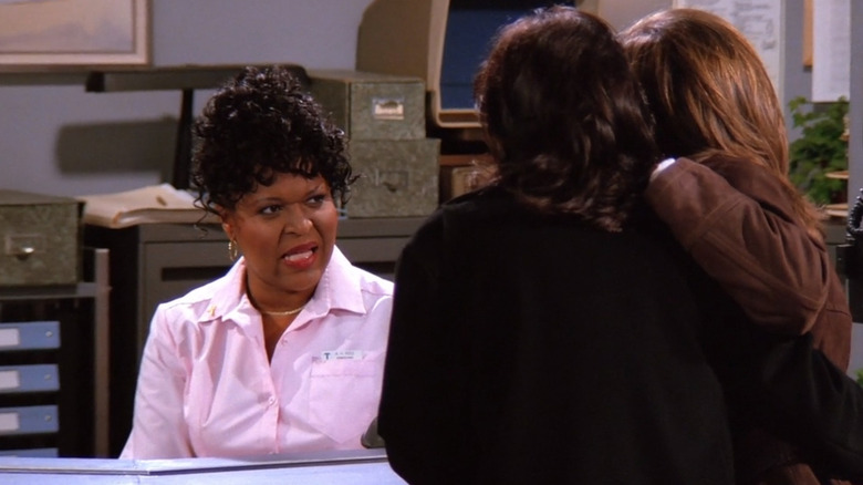 The Season 1 episode, "The One with Two Parts: Part 2," finds the gang at a busy New York hospital for a variety of reasons. Their progress in receiving medical care is tempered and hindered by a hospital gatekeeper, a nurse listed in the credits as "The Admissions Woman." She is not a big fan of the group — she won't admit Ross' pet monkey Marcel (who swallowed a Scrabble tile), chastises Rachel (who has possibly broken her ankle taking down Christmas lights) for waiting until February to take down her decorations, and calls Monica an idiot when she attempts to commit insurance fraud.