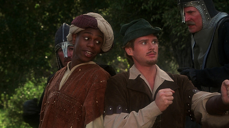 Chappelle provides plenty of laughs as Ahchoo, the right-hand man to Cary Elwes' Robin of Loxley. Robin has agreed to look after the young Ahchoo after his father, Asneeze (Isaac Hayes), helps him escape from prison during the Crusades with a great feat of strength, which was actually great strength of feet. Upon returning to his beloved England, Robin happens upon Ahchoo, as he's being harassed by the Sheriff of Rottingham's (Roger Rees) men, a scene in which Ahchoo asks for a break because he's "running out of air" and then uses the brief respite to re-inflate his Reebok Pumps. Ahchoo is also responsible for delivering the immortal line "Pissed off? If I was that close to a horse's wiener I'd be worrying about being pissed on!" to the angry sheriff, whose broken saddle has inverted him to a position straddling his horse's stomach. Ahchoo, upon Robin naming him the new sheriff at the end of the film, also reminded the surprised townspeople that "Blazing Saddles," another Mel Brooks movie, also featured a black sheriff.