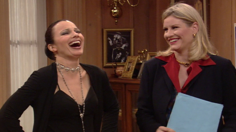 On the long-running CBS sitcom "The Nanny," Fran Drescher starred as Fran Fine, the self-proclaimed fashionista who shows up on the doorstep of British millionaire Maxwell Sheffield and becomes live-in nanny to his children Maggie, Brighton, and Grace. Flanked by uptight butler Niles and Maxwell's business partner C.C. Babcock, Fran hams it up as the out-of-place loud-mouthed New Yorker stuck in the middle of the stuffy, aristocratic British-American household. Many viewers probably recognized Drescher from her film roles in the '80s, and in one stand-out episode, "The Nanny" delivered a particularly clever callback.