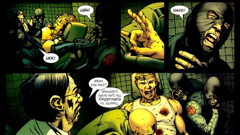 However, the most infamous demonstration of Clint's near-superhuman skill is in "Ultimates 2" vol. 1 #10, which is set in a parallel reality. Bloodied and tied to a chair, this version of Clint pulls off an incredible escape attempt by flicking out his own fingernails and killing his captors.