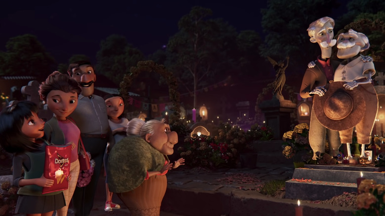 The Doritos commercial, which translates to "It's never too late to be who you are," went viral online and currently sits at more than 15 million views on YouTube alone. The animated advertisement sees a family of five approaching their Uncle Alberto's altar, which is surrounded by candles and flowers. As his sister places a bowl of Doritos in front of a framed portrait, he returns from the dead to greet them — and he's not alone. Alberto's partner, Mario, is by his side. This draws initial surprise from his family, though his sister claps and exclaims, "What a miracle! I thought you would be alone forever!"
