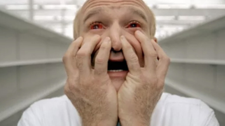In truth, Seymour "Sy" Parrish doesn't really become the antagonist of "One Hour Photo" until partway through the film. When we first meet Sy, he's presented as nothing more than a lonely employee who mans the one hour photo station in a big box store. He does seem to take excessive pride in his "vital service," taking extra care with the Yorkin family's photos — photos that he's made duplicates of as part of an ever-growing obsession with their seemingly idyllic life. Once he discovers Mr. Yorkin's recent adultery, his image of their family life as perfect is irreparably damaged. This causes Sy's already tenuous grip on reality to crumble, and his growing instability is represented visually through a disturbing dream sequence set in a clean white room. The scene culminates in Sy's eyes gushing blood as he screams, ending the nightmare. The sequence is a simple yet viscerally effective way of showing just how unhinged Sy is.