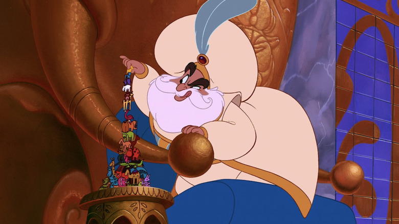 Checking the criteria of a top-level Easter egg, there's a nod to the 1991 Disney animated feature "Beauty and the Beast" in "Aladdin." The Easter egg in question is on screen for just a few seconds, but it's unmistakable once you see it. Shortly after the 45-minute mark, a scene opens with the Sultan stacking toys. A variety of animal figurines are piled on top of one another, and as the camera quickly pans up, you can see a Beast figure on the left side of this tower. He's there, cape and all, poking his monstrous snout out from all the rest of the relatively normal-looking playthings. Be our guest and take a look for yourself over on Disney+.