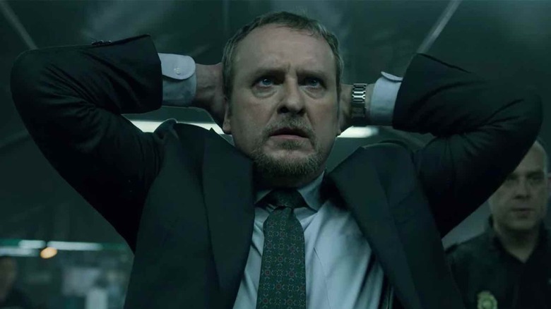 In the second heist of Seasons 3, 4, and 5 on Netflix, the main antagonist inside the Bank of Spain is a self-righteous, angry guard named César Gandia. He takes his role as the arm of "right" very seriously, viewing it as his responsibility to take down the thieves. He gets his chance when Palermo, angry at his ouster from the crew, gives him a tip for how to escape. Of course, Rio is too weak to stop Gandia, and after his release, he executes everybody's favorite member of the team. His actions in her death aren't those of a noble hero, though — he executes her specifically because she's a woman and of mixed descent, which made her power over him something he could not accept.